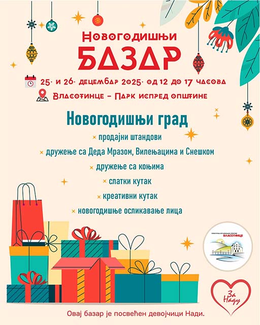 Овај, као и претходни новогодишњи базари у Власотинцу, има хуманитарни карактер. Новчани прилози и део прихода од продаје рукотворина намењени су малој Нади Станковић из Бољара.